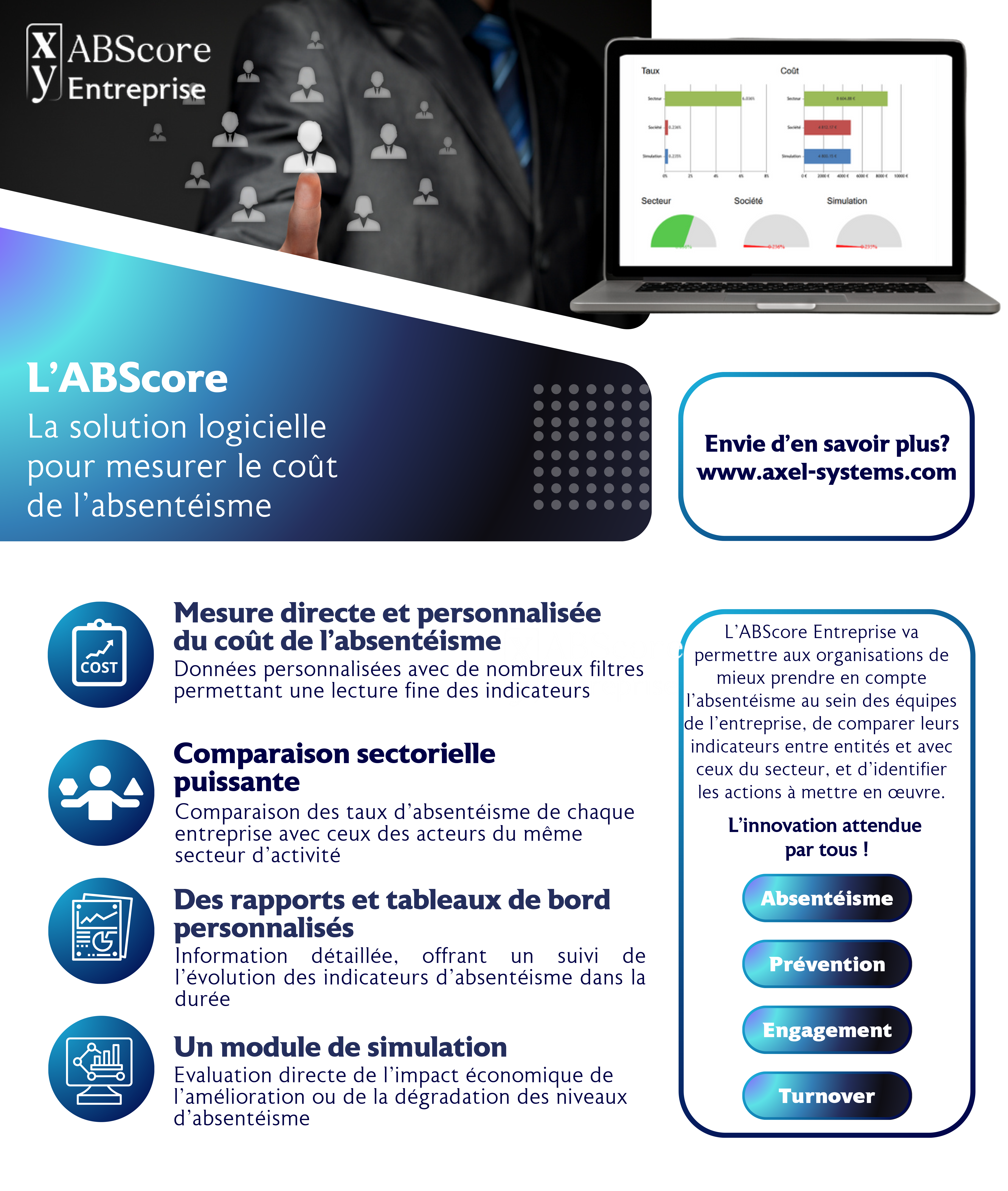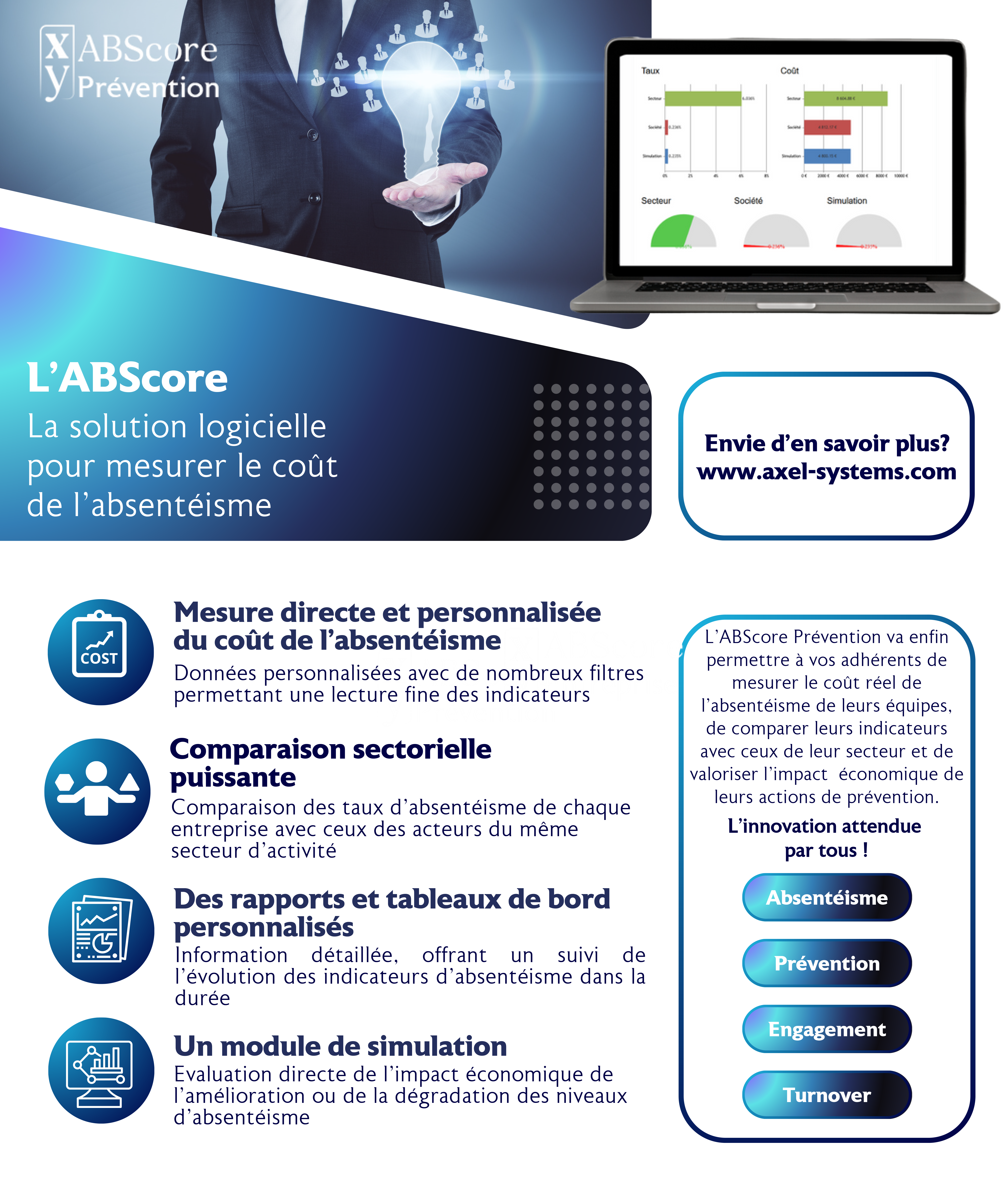 En proposant l’ABScore, l’objectif des équipes d’Axel Systems est d’aider les entreprises dans la compréhension et la mesure de l’impact économique de l'absentéisme, pour en déduire des actions concrètes destinées à développer une prévention performante.
